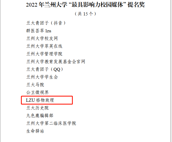 近日,永利集团304am登录党委宣传部印发《关于表彰2022年永利集团304am登录“好新闻奖”系列新闻评选活动获奖作品、单位及个人的通知》,对“永利集团304am登录”官方微信等30家“最具影响力校园媒体”(含提名奖)进行表彰,学院团学工作微信公众号“LZU格物致理”入选。