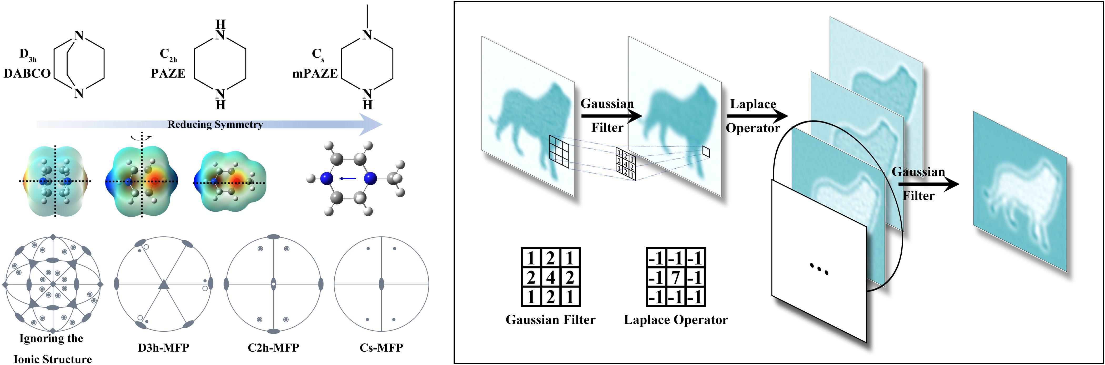 基于此,近日团队进一步提出基于体光伏效应(BPVE)实现自供能探测的新思路,并首次构建了基于极化MFP材料的自供能X射线探测器。团队以A位阳离子对称性调控为核心设计策略,通过构筑非对称离子构型诱导晶体极性,增强材料内部的极化电场以驱动载流子分离与收集。通过理论计算结合实验辅助证实了极性基团对体系中缺陷态与深能级响应的调控作用,辨析了其作用机理。所构建器件在0V偏压下实现了超高的探测灵敏度。同时,研究还提出了基于该类器件的“传感器内计算”成像新方案,为构建高性能X射线成像系统提供了参考。相关成果以“Evidence of Cation Symmetry Reduction Induced Bulk Photovoltaic Effect in Metal-Free Perovskite for Efficient Self-Powered X-Ray Detection”为题发表在《Advanced Materials》上 (Adv. Mater. 2025, 37, 2502335)。