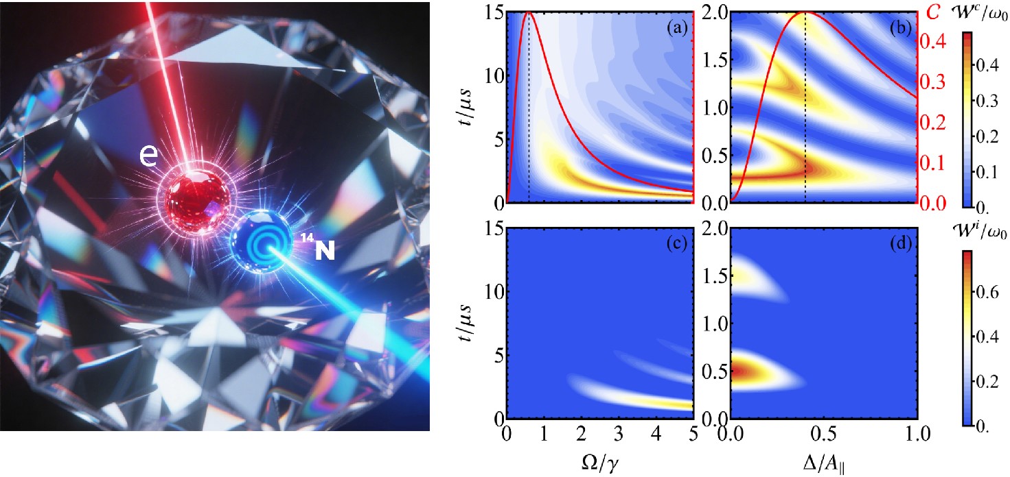 该工作基于金刚石氮-空位色心体系,提出了一种能够延缓自放电的量子电池方案,为解决量子电池中自发放电这一关键科学问题提供了全新的思路。该方案采用金刚石氮-空位色心中的电子自旋作为量子电池的物理载体,其周围的碳-13原子核自旋库诱导电子自旋发生退相干,从而引发量子电池的自放电现象。由于量子电池中的相干可提取功比非相干可提取功衰减更缓慢,该研究提出通过在充电过程中提升相干可提取功的占比,来增强量子电池对自放电的抵抗能力。更为有趣的是,金刚石氮-空位色心体系中特有的电子与氮-14原子核自旋之间的超精细耦合,为提高相干可提取功占比提供了理想的调控手段。该工作首次同时实现了对量子电池可提取功的优化与自放电的有效控制,对于推动量子电池的物理实现具有重要理论指导意义,同时展示了金刚石氮-空位色心体系在量子能源器件开发中的巨大潜力。该工作是该团队继2024年提出抗老化的远距无线充电量子电池方案[2]后,取得的另一重要成果。