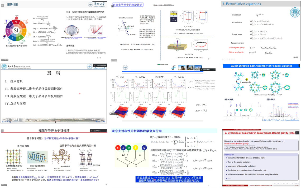 在本届学术论坛上,学院的博士后总共带来了14个精彩的学术报告,内容主要包括量子系统、引力与黑洞物理、水系二次电池电极材料及电解液、强子物理、磁性理论、微纳光学、储能器件机制、手性铁磁材料、超分子自组装与超分子功能材料、自旋电子学、新型电化学储能材料与器件等。学院刘翔、安钧鸿、黄亮、兰伟、周金元、刘占伟、田永辉、柴国志、高存绪、杨德政等多名教授应邀参加了论坛,围绕学术报告的构思、学术报告的技巧、报告PPT的美化等方面进行了点评和指导,使各位博士后受益匪浅。安钧鸿教授在点评中指出组织科研、项目申请和学术交流是科研工作者必不可缺的三大能力,希望博士后利用博士后这一黄金时间多思考、多实践、多优化,形成独具特色的研究方向,提升核心竞争力。兰伟教授在点评中希望博士后能够在做报告的过程中注意时间的把控、所讲内容的逻辑性、幻灯片的美观性等,借助一切可利用机会锻炼提升自己学术报告。此次论坛共有近80人次观看,为相关领域的科研工作者提供了一个深入交流及促进的平台。