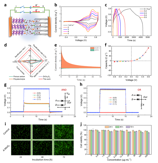 图3. 氧化钼基电容式离子二极管的整流性能及生物相容性