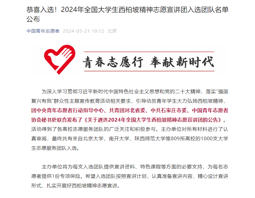 近日,团中央青年志愿者行动指导中心、共青团河北省委、中共石家庄市委、中国青年志愿者协会秘书处联合发布了《关于遴选2024年全国大学生西柏坡精神志愿宣讲团的公告》。永利集团304am登录物理科学与技术学院“红色探寻”西柏坡精神志愿宣讲团成功入选。