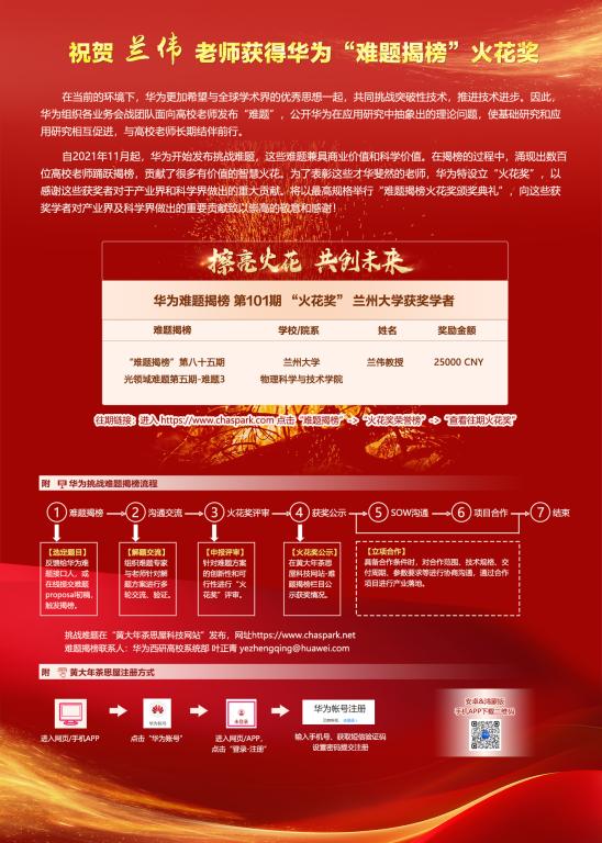 8月12日,华为技术有限公司在黄大年茶思屋发布了“难题揭榜”第101期火花奖获得者名单。我校物理科学与技术学院兰伟教授获此殊荣。