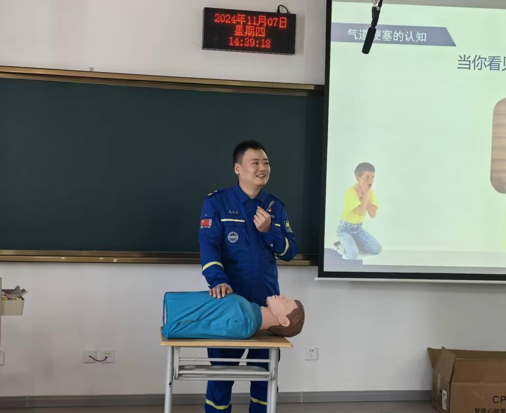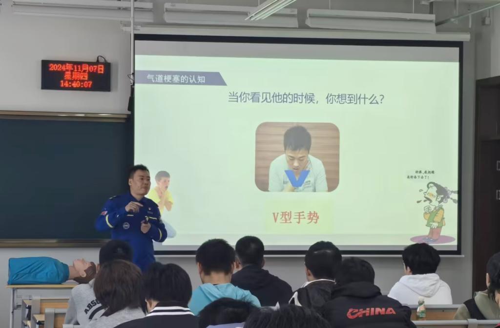 薄文杰围绕气道梗塞和心搏骤停两大主题,通过理论讲解和操作演示相结合的方式,详细介绍了相关的急救知识和方法,为同学们带来了一堂生动的应急救护课。薄文杰首先对气道梗塞的原因进行了讲解,随后,薄文杰结合道具介绍应对气道梗塞的海姆立克急救法,并分步演示了成人和儿童在遇到气道梗塞时的急救操作。在讲解心搏骤停相关知识时,薄文杰结合近几年的实例,强调了心搏骤停的严重性。紧接着,他详细讲解了心搏骤停的急救手段,并介绍了自动体外除颤器的使用方法。