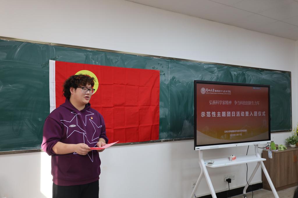 为进一步加强基层团组织建设,引导团员青年勇当强国建设民族复兴的先锋队、突击队,12月17日,永利集团304am登录在城关校区格致楼段一士学术讨论室举行“弘扬科学家精神 争当科技创新生力军”示范性主题团日暨入团仪式。研究生凝聚态五班团支部成员,学院2024年下半年新发展团员代表,学院各团总支、团支部书记参加活动。学院任继荣副教授、校团委创新发展与实践中心主任田贯辉、学院团委书记张晓晓、学院团委副书记樊金雷出席活动。学院团委副书记(学生兼职)郝铭淳主持活动。
