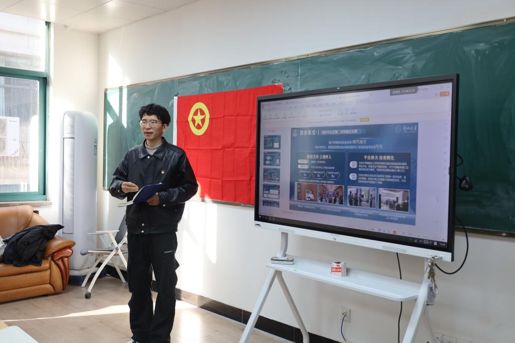 活动邀请中国国际大学生创新大赛(2024)金奖团队成员、化学化工学院2021级本科生陈明富交流分享了学习《习近平给中国国际大学生创新大赛参赛学生代表的回信》的心得体会和参加创新创业活动的经验,他谈到作为青年大学生要保持斗志、练好内功,以更加饱满地热情和澎湃的动力投身科技强国事业,践行习近平总书记的殷殷嘱托。凝聚态研究生五班团支部张天尧代表新发展团员发言,表示将肩负起共青团员的光荣使命,践行习近平总书记关于发展新质生产力的重要指示,将个人的理想追求融入国家发展大局,为强国建设民族复兴伟业挺膺担当。2021级本科生洪雨欣代表优秀团员发言,她结合自身学生工作经历,鼓励同学们在拼搏实干中创造业绩、在点滴小事中满怀感情地为他人服务,在励志求学、知行合一的实践中书写闪光的青春。