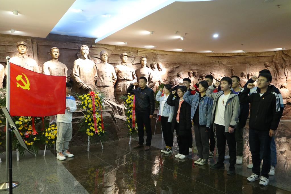 在纪念馆内,一行人在讲解员的介绍下重温了中国共产党甘肃历史上的壮丽篇章以及榆中革命斗争的峥嵘岁月,一个个闪光的名字、一件件感人的故事把在场师生带回到了激情燃烧的红色年代。同学们不时在展出的革命文物前驻足凝视,在油画展板下追忆思考。随后,一行人来到“张一悟生平事迹”展馆,了解了张一悟作为“甘肃建党的创始人”和“劳动人民最忠实的儿子”,从为陇原大地播下革命火种,到多地辗转身陷牢狱,再到被营救后继续从事革命工作直至去世的光辉一生,感悟革命先辈矢志不渝的理想信念、百折不回的革命精神和视死如归的英雄气概。参加活动的党员师生在党旗下重温了入党誓词。