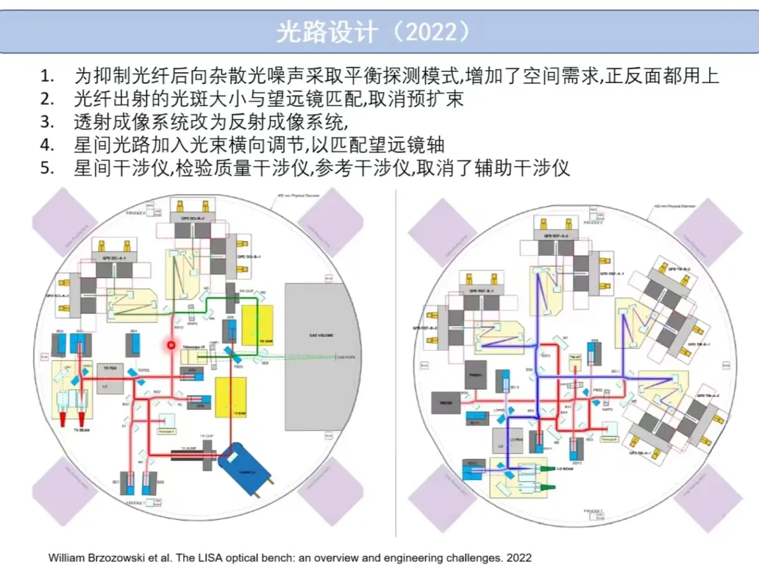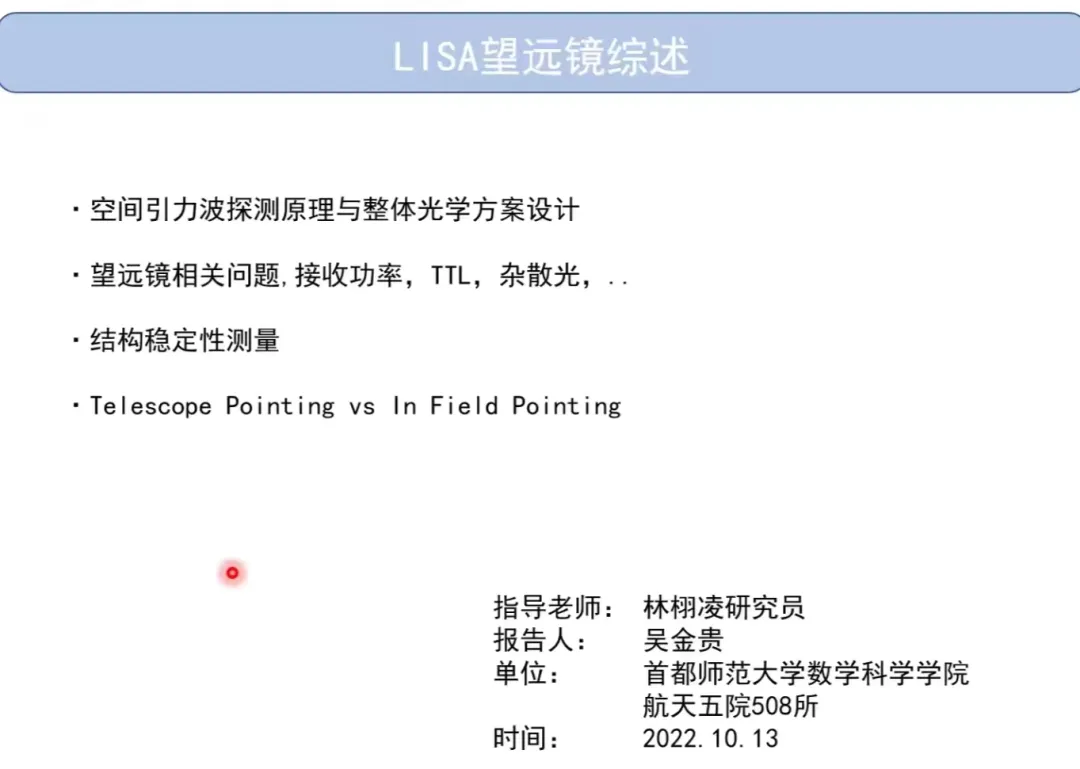 报告首先从引力波探测原理和整体光学方案开始,引出与望远镜相关的问题,深入浅出地介绍了LISA文献中对望远镜的研究。并介绍了不同呼吸角补偿方案下的望远镜光学设计,指标要求以及相应的实验测量结果。报告通过展示从1998年到2022望远镜光路设计的变化,展现了望远镜不断改进发展的过程。并由此引出望远镜的噪声与灵敏度,望远镜口径、传输功率与散粒噪声,波前像差与远场TTL耦合,几何光学像差定义等相关问题,解释了望远镜实现精密化发展的物理原理。