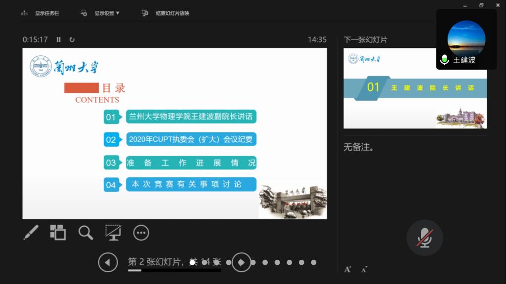 王建波代表承办方和与会代表致辞,对与会代表积极参与本次会议表示衷心感谢,就进一步做好西北赛区竞赛的前期各项准备工作进行了动员和部署,希望大家共同努力,战胜疫情的影响,办出本次大赛的特色。王心华向各与会代表介绍了2020年CUPT执委会(扩大)会议的有关情况,详细传达了会议精神,汇报了关于竞赛发起和筹备进展工作情况。