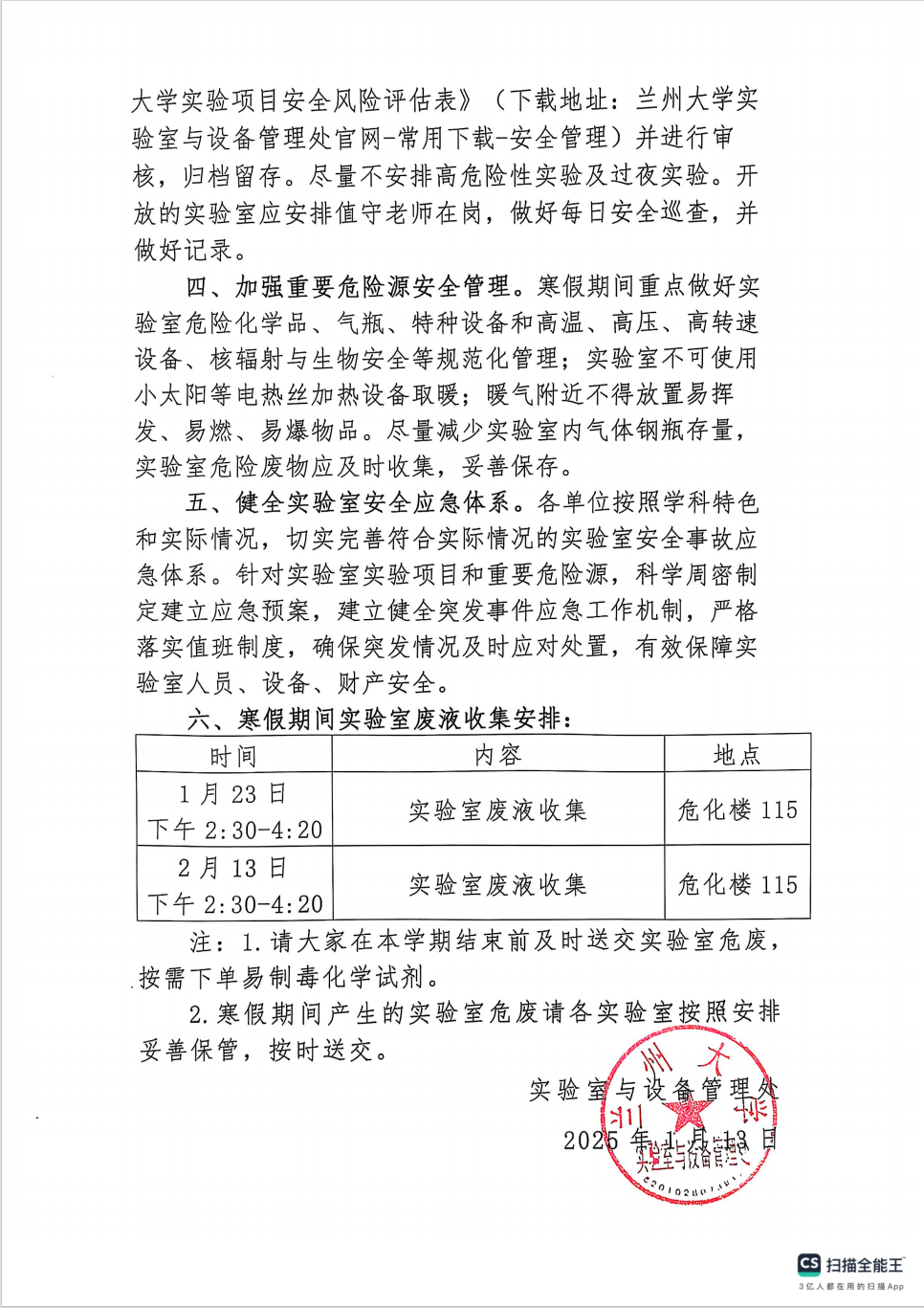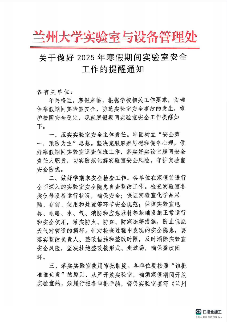一、实验室责任人应严格按照实验室设备管理处《关于做好2025年寒假期间实验室安全工作的提醒通知》(附件一)的内容,督促学生做好离校前的实验室安全处理。