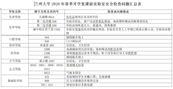 4月底,学校实验室与设备管理处的《实验室安全工作简报》(2020第3期)对全校实验室安全问题检查情况进行了通报,对存在安全隐患的学院(见下表)以书面 “整改通知书”形式督促落实整改。3-4月份,我院实验室安全形势总体平稳,相关检查均未发现永利集团304am登录存在明显安全隐患,我院未被要求整改。