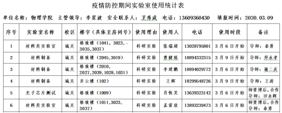 通过师生提交《疫情防控期间实验室开放使用申请表》、学院实验室安全技术主管卫秀成对申请人员和实验室进行核实、检查,共批准6位已在校研究生、14个实验室开展科研工作。详情见下表。自疫情初期开始,格致楼楼道等公共区域均每日进行(84消毒液)喷雾消杀处理。