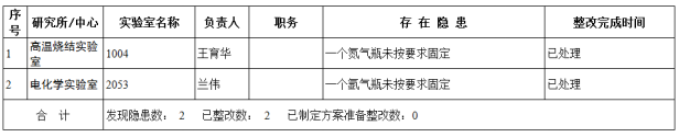 本次检查中,学院实验室气瓶的存放、使用等情况整体良好,个别实验室存在气瓶换装后未固定安全隐患。